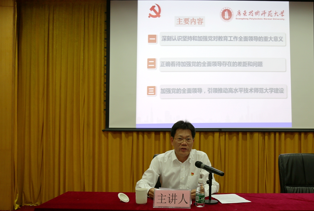 为扎实推进“不忘初心、牢记使命”主题教育,学校领导班子成员做表率、带头落实。按照中央、省委的部署要求和学校主题教育实施方案的安排,全体党员校领导在深入基层开展调查研究的基础上,到分管单位或联系的党支部讲专题党课。10月30日下午,学校党委书记凌靖波在东校区一教208讲学厅以《加强党的全面领导,践行党的初心使命,为建设高水平技术师范大学提供坚强政治保证》为题上专题党课,学校省管干部、全体中层领导干部、全校党支部书记到场聆听。专题党课由学校党委副书记李向明主持。