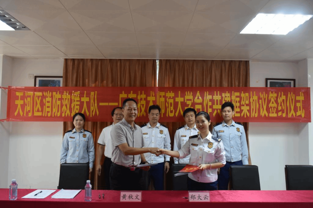 黄秋文、郑大云分别在协议书上签字。民消共建框架协议书内容包括天河区消防救援大队将结合我校实际对学校的消防安全隐患排查、消防知识宣传教育、消防演练与培训、建立健全消防管理制度等提供帮助和指导,同时我校将为天河区消防救援大队选拔输送优秀大学生加入消防救援队伍等。学生服役两年后可参加应急管理部门组织的内部转干考试,考试通过后成为国家公务员编制人员,这将为我校毕业生提供一条新的就业渠道。