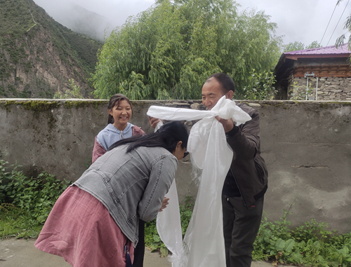 抵达日布村时,正值大雨,扎西旦巴一家刚从田里赶回,一路小跑着过来迎接支教队员去他家做客。妈妈帕加一直热情地招呼老师们吃自家做的奶渣、牛肉干、果干和酥油茶。