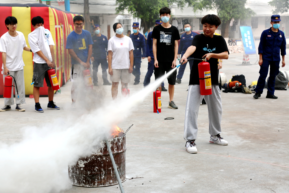 在消防器材使用讲解区,消防指战员向在场师生员工讲解了如何预防火灾的发生、发生火灾后如何应对、如何正确报火警等消防知识,人员在紧急情况下疏散的方向、路线和逃生的基本技能,建筑物内消防应急疏散指示标志灯的作用和如何在火场内利用疏散标识。消防指战员还使用灭火器扑救初期火灾进行了现场示范,现场组织师生员工进行了扑救演练。