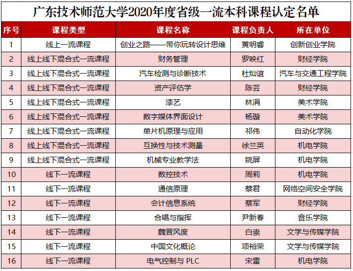 12月25日,广东省教育厅正式公布2020年度省级一流本科课程认定结果,我校“金课”建设实现重大突破,共有16门课程入选广东省一流本科课程。其中,省级线上一流课程1门,线上线下混合课程8门,线下一流课程7门。截至目前,我校获批认定国家级、省级一流本科课程达到21门。