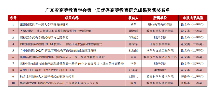 1月6日,广东省高等教育学会公布了第一届优秀高等教育研究成果奖获奖名单,我校共获10个奖项,其中一等奖3项,二等奖4项,三等奖3项,获奖数居全省各高校前列。
