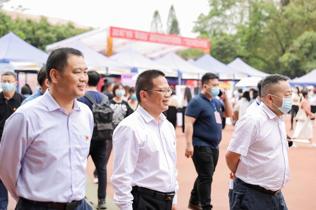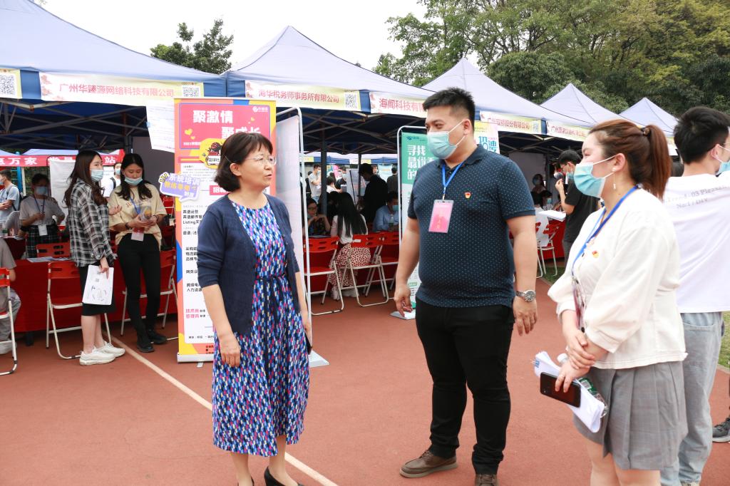 4月7日,由广州市人力资源和社会保障局,中国南方人才市场管理委员会办公室(挂广州市高校毕业生就业指导中心牌子)与我校联合举办的“2021年广州市‘阳光就业’高校毕业生系列专场招聘会”在我校东校区举行。学校党委副书记李向明、副校长许玲,广州市人力资源和社会保障局一级调研员、市管干部杨庆华,中国南方人才市场管理委员会党委书记刘新堂到现场指导工作。广州市人力资源和社会保障局就业处、中国南方人才市场管理委员会办公室、广州市高校毕业生就业指导中心、广州市青年就业创业协会的相关领导,各学院党委(党总支)书记、副书记、负责就业工作的辅导员到场参加活动。