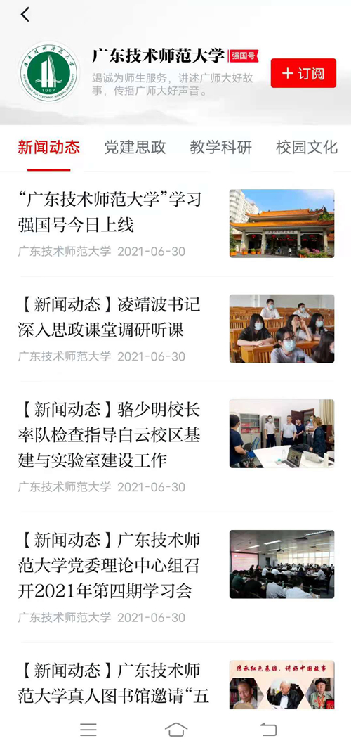 “广东技术师范大学”学习强国号开设“新闻动态”“党建思政”“教学科研”“校园文化”“在线课堂”“媒体广师大”等6个栏目,通过图文、音视频等形式,全方位展示广东技术师范大学在党建思政、教育科研、人才培养、文化传承、改革发展和服务地方经济等方面取得的新进展、新成果、新风貌。