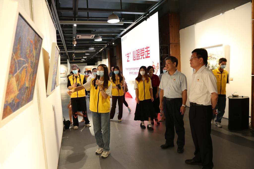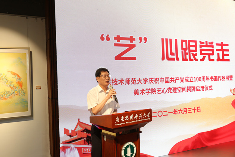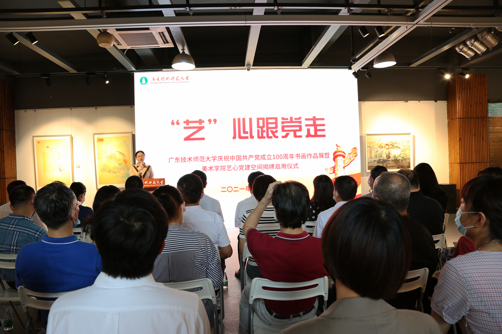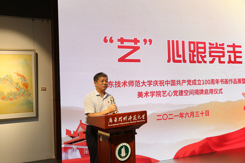 翰墨忆党史,丹青颂党恩。为庆祝中国共产党百年华诞,进一步推进党史学习教育走深走实,6月30日,由党委办公室、党委组织部、党委宣传部主办,美术学院承办的“‘艺’心跟党走”广东技术师范大学庆祝中国共产党成立100周年书画作品展在东校区福慧美术馆开展,同时美术学院艺心党建空间同步揭幕启用。