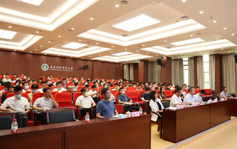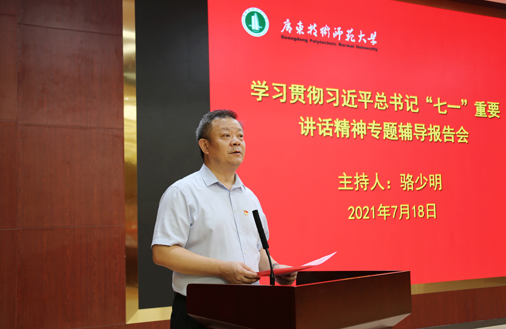 根据省委教育工委党史学习教育领导小组办公室《关于抓好高校暑假期间党史学习教育的通知》要求,为持续巩固和拓展学校党史学习教育良好态势,在暑假期间保持学习不放松、不掉线,引导广大党员干部学深悟透、融会贯通习近平总书记“七一”重要讲话精神,结合党史学习教育工作实际,7月18日,学校举办学习贯彻习近平总书记在庆祝中国共产党成立100周年大会上的重要讲话精神专题辅导报告会。中共广东省委党校(广东行政学院)党史党建部主任梁道刚到会指导并作专题报告。全体校领导、全体中层干部、师生代表参加。会议由学校校长骆少明主持。
