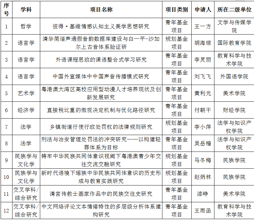 据悉,本年度教育部人文社会科学研究一般项目全国共立项2754项,其中,规划基金、青年基金、自筹经费项目共2362项,西部和边疆地区项目152项,新疆项目15项,西藏项目1项,中国特色社会主义理论体系研究专项15项,高校辅导员研究专项209项,高校思想政治理论课教师研究专项尚未公示立项结果。