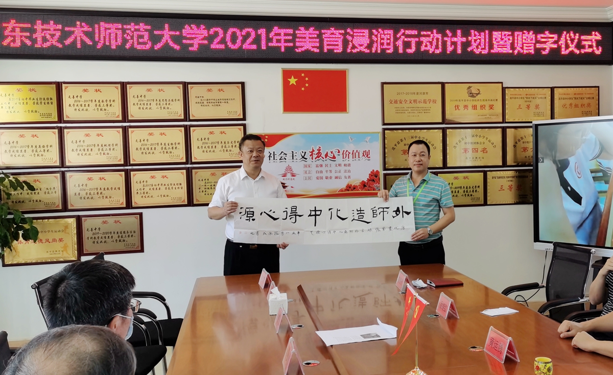 骆少明、苏晖前往中心小学等四所学校深入了解各校的美育教育现状,观看了美育浸润的阶段成果,赠送了优秀书法作品,深入教学课堂询问教学困难,与当地的老师进行座谈,听取我校浸润团队学生工作的开展情况,详细询问学生团队的生活、工作情况,与当地教育局就我校美育浸润的深度合作展开了交流。