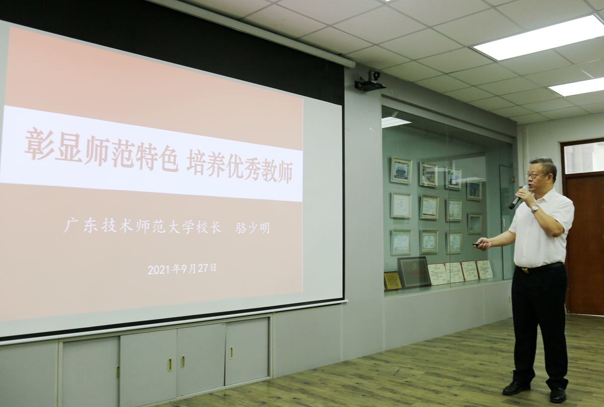 骆少明简要介绍了我校师范专业设置、培养目标定位、建设思路、建设理念,详细阐述了我校“校政企校”四位一体、八位协同、八个对接的职教师资协同培养机制,“中-高-本-硕”贯通培养体系,“三导师制”教学团队的组建,“六个三” 培养模式的实施,卓越教师教育校级、省级、国家级等三级专业体系的建立,教师执业能力为导向的课程体系的开发,“内外联动”实践教学体系和PDCA循环的教学质量监控体系的构建,师资培训品牌的打造,展示了我校专业建设成果突出、教师教育教改成果丰硕、师范生培养质量逐年提高、服务教师教育能力日益增强和教师教育培养培训受到媒体关注等我校师范专业建设成效,并提出了下一阶段的工作设想。