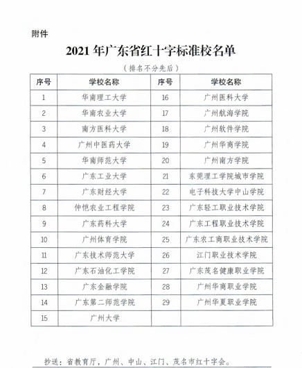 近日,省红十字会和省教育厅联合公布了2021年广东省红十字标准校创建结果,我校成功入选省红十字标准校创建单位,成为广东省29所红十字标准校之一。