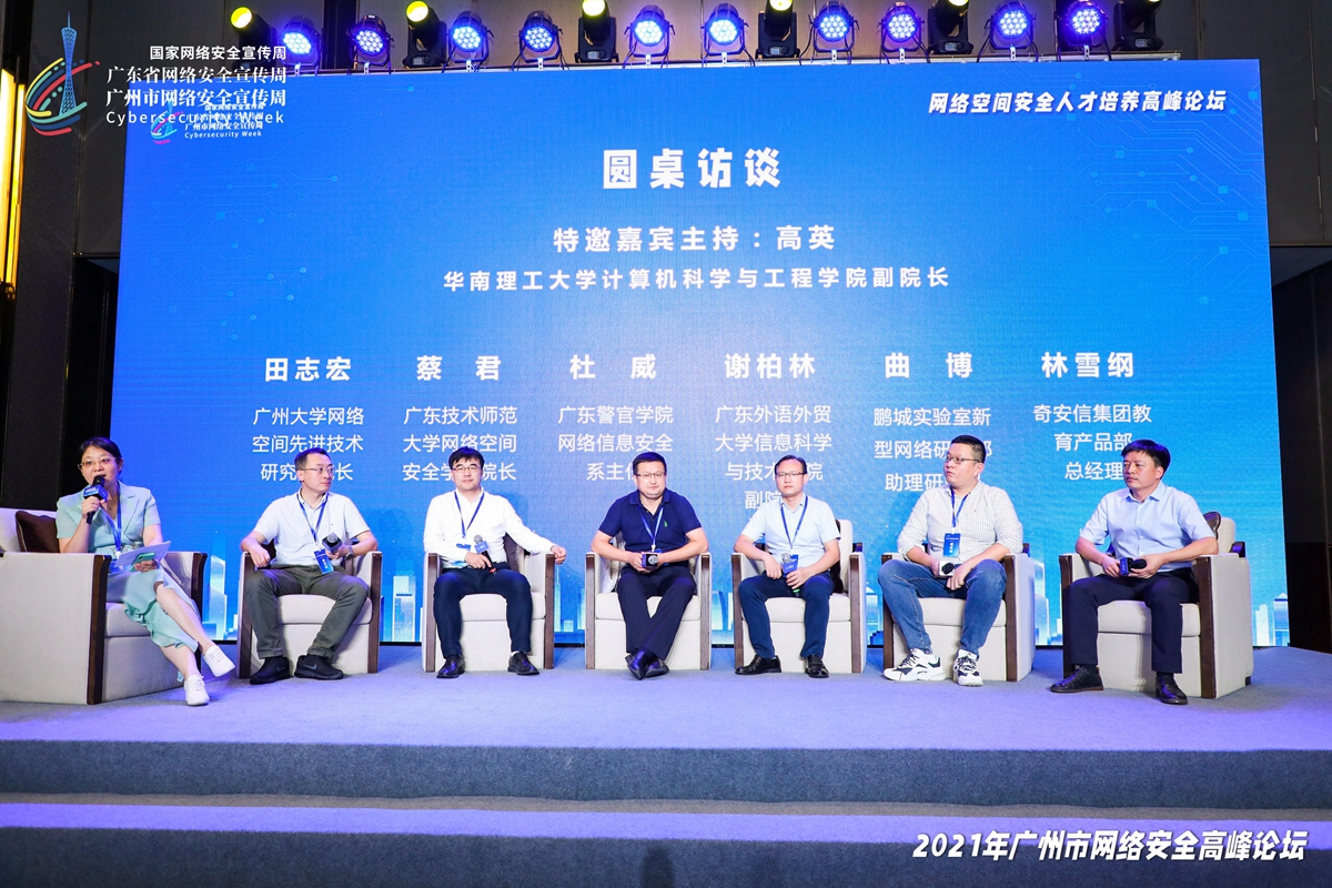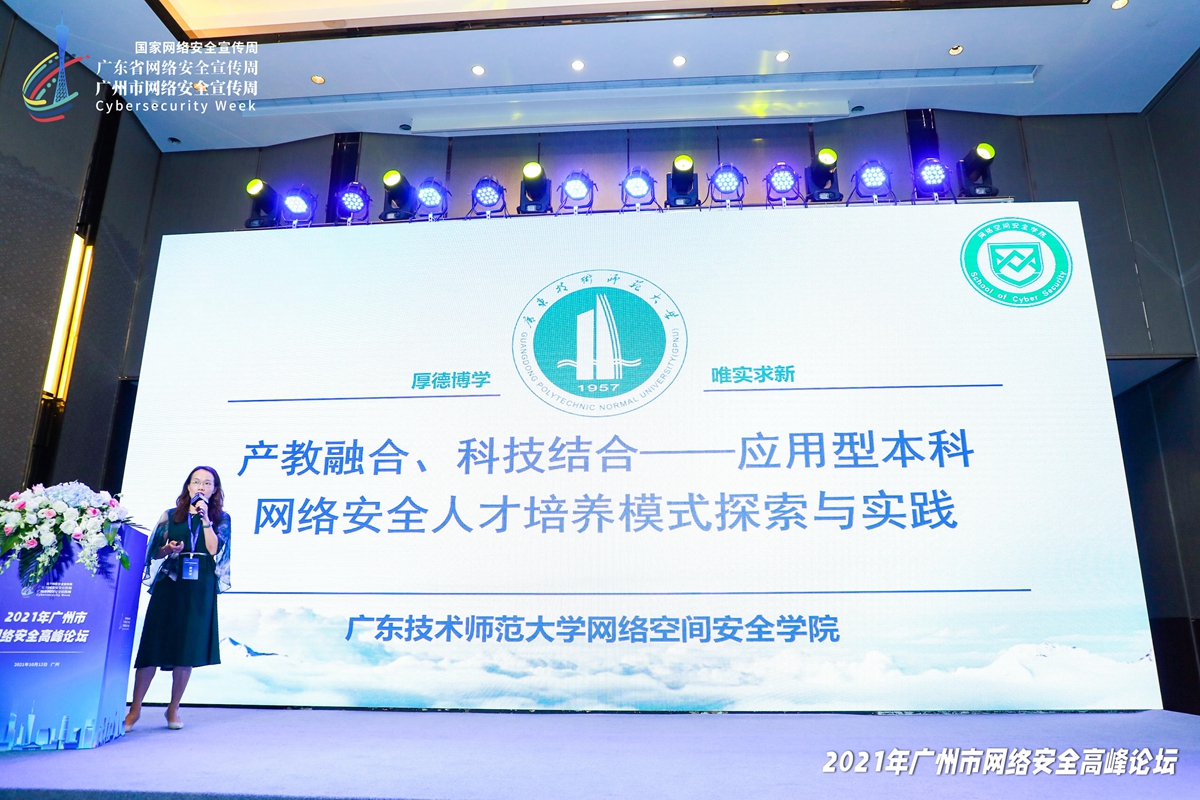 随后,广州大学、广东技术师范大学、广州番禺职业技术学院以及企业相关代表分别介绍了高层次人才、应用型本科人才、职业教育人才等不同体系人才的培养模式及实践经验,探索引企驻校、引校进企等模式。会上,我校网络空间安全学院院长蔡君教授参加了圆桌访谈,与现场多位网安领域知名专家学者、企业高管共话网络安全,就网安人才的培养方向、问题与挑战等进行研讨;网络空间安全学院直属党支部副书记肖茵茵作了题为“产教融合、科技结合——应用型本科网络安全人才培养模式探索与实践”的汇报,介绍了学院在“高水平、高起点、新机制、新模式”要求下的人才培养特色;网安学院专业负责人及学科带头人等骨干教师均参与了此次论坛活动,在实践中深刻领会习近平总书记在中央人才工作会议上的重要讲话精神。