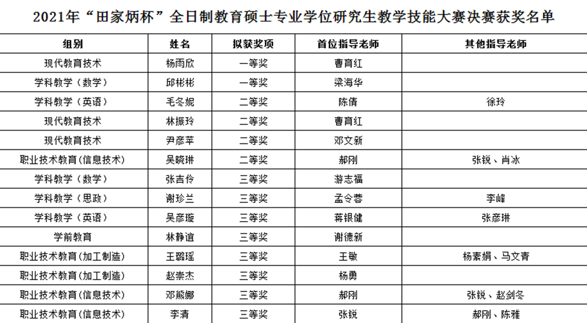 近日,由全国教育专业学位研究生教育指导委员会主办、浙江师范大学承办的“田家炳杯”全日制教育硕士教学技能大赛圆满落幕。我校14名教育硕士研究生喜获一等奖2项、二等奖4项、三等奖8项,获奖率高达52%,高出全国平均水平22%,创下了我校在历届“国赛”中的最好成绩。