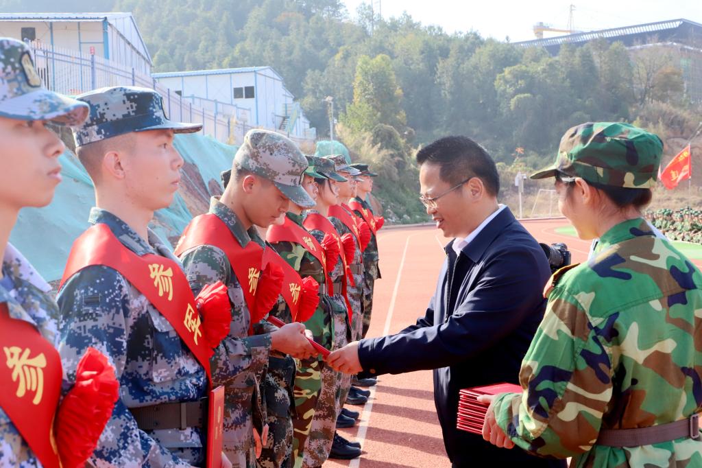 军训团副政委、河源校区管委会主任陈作雄宣读了《关于聘任李青山等11名退伍复学同学为我校国防教育义务宣传员的决定》。李向明为受聘国防教育义务宣传员的退伍复学同学颁发国防教育义务宣传员聘书。