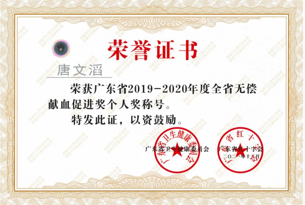 近日,省卫生健康委和省红十字会联合公布了全省无偿献血先进团体和个人名单,我校团委唐文滔老师获评“广东省无偿献血先进个人”荣誉称号。