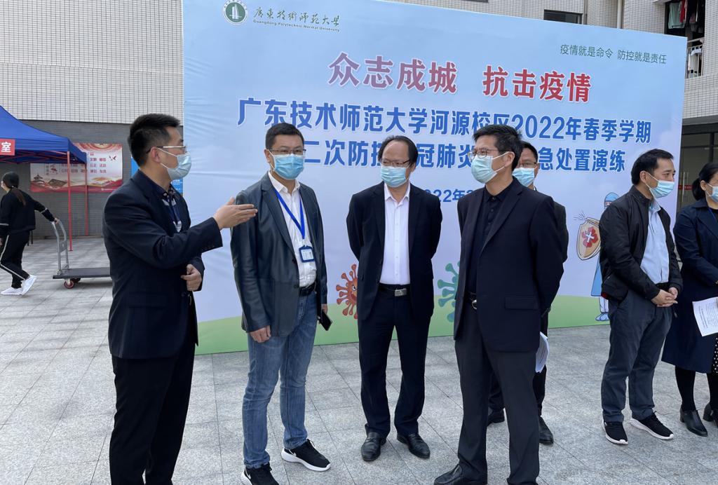 为科学、规范、有序地开展新型冠状病毒肺炎疫情防控工作,进一步提高河源校区疫情防范和应急处置能力,切实做到早发现、早报告、早隔离,保障全体师生员工的身体健康和生命安全,维护校园安全和教学秩序稳定。根据学校、属地工作部署,结合河源校区实际,3月30日,我校河源校区举行2022年春季学期第二次防控新冠肺炎疫情应急处置演练。学校副校长苏晖、河源校区管委会全体成员、辅导员、河源校区物业公司工作人员等参加本次演练。东源县人民医院副院长何平胜率医务人员应邀参加演练并给予指导。