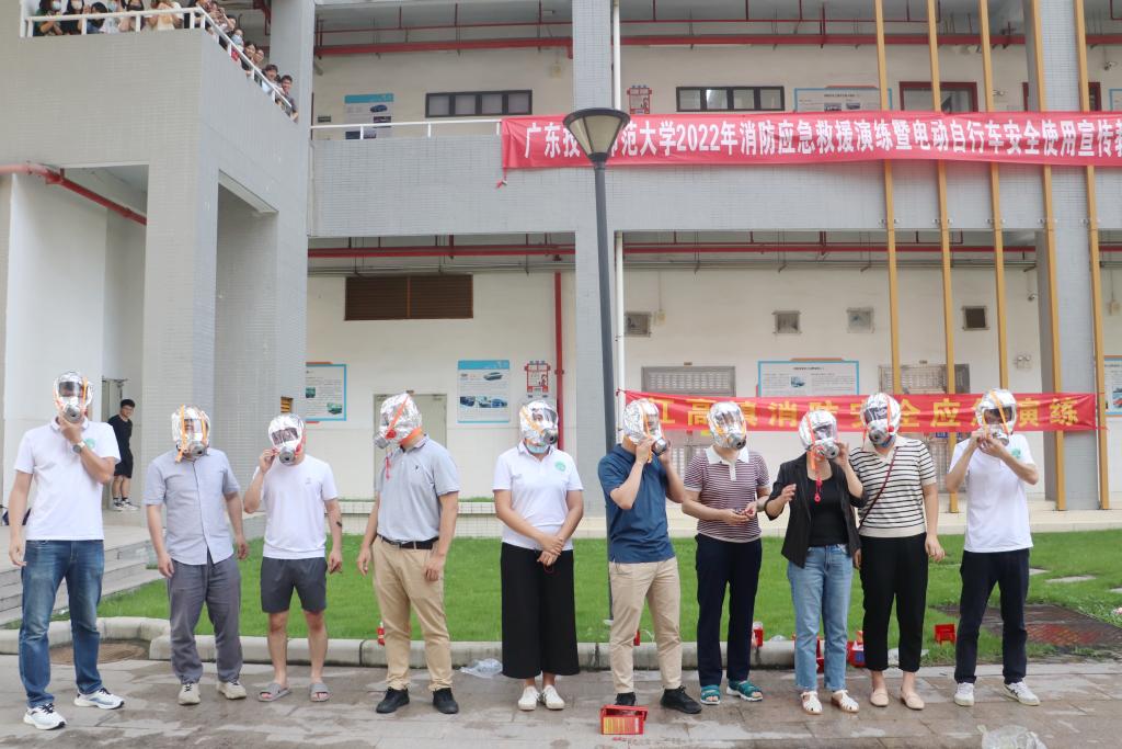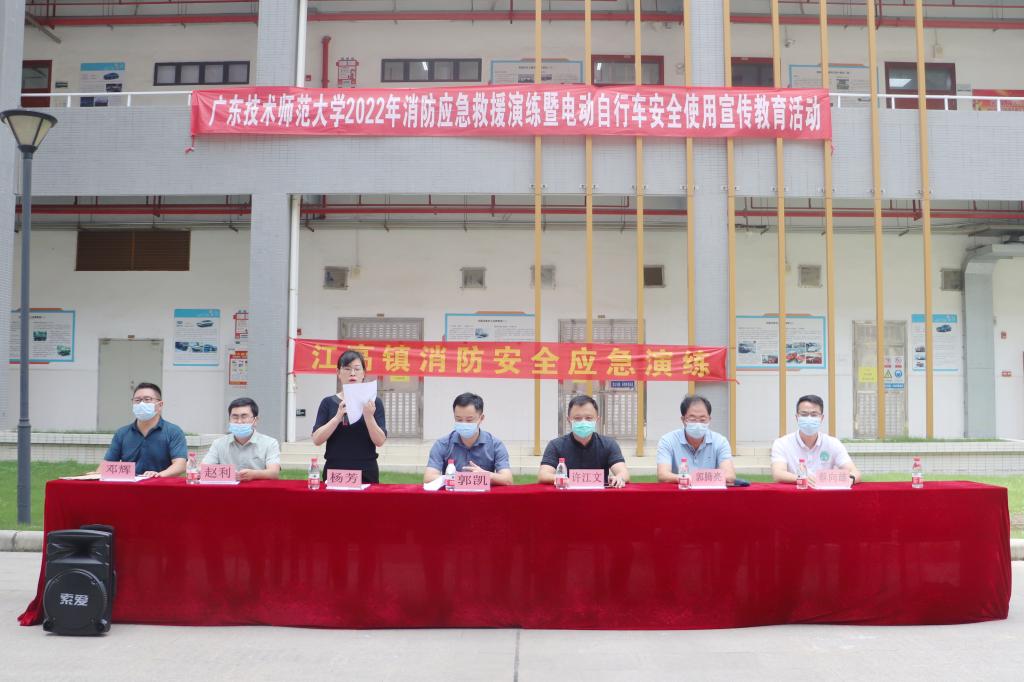 为全面提高我校应对突发事件的能力,切实提高师生消防安全意识和素质,提升实验室安全管理水平,有效维护校园消防安全稳定,6月15日,我校在白云校区举行了2022年消防应急救援演练暨电动自行车安全宣传教育活动。江高镇副镇长郭凯,江高镇专职消防队队长覃作杨应邀到校指导活动。安全保卫处、白云校区办、资产与实验室管理处、汽车与交通工程学院、机电学院、自动化学院等部门相关负责人以及师生代表参加了本次活动。