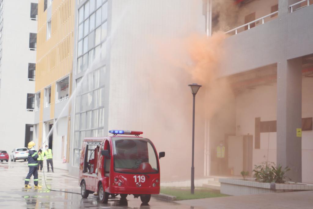 在开展消防应急救援演练时,急促的消防警铃声响起,第一实训楼204实验室内发生疑似火情,实验室管理人员迅速报告至学校安保处,安保处迅速派出救援力量进行火灾的初期扑救,学校微型消防车第一时间赶到现场灭火扑救,控制系统消防广播持续播放疏散指引,工作人员组织实验室内的师生疏散,师生迅速用身边的毛巾或者手帕等捂住口鼻,猫腰沿着疏散楼梯、安全出口有序撤离至安全区域。同时拨打119火灾报警电话,消防指战员迅速赶到现场进一步进行灭火救援,疑似火情得到有效处置,演练达到预期目的。