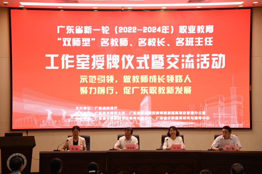 6月16日上午,广东省新一轮(2022-2024年)职业教育“双师型”名教师、名校长、名班主任工作室授牌仪式暨交流活动在我校顺利举行。本次活动由省教育厅主办,广东技术师范大学、省职业院校教师素质提高项目管理办公室承办,省中等职业学校教师发展中心、省中职德育研究与指导中心协办。全省各有关地市教育行政部门分管领导,有关高职院校领导,名教师、名校长和名班主任工作室主持人等80余人参加了活动。省委教育工委委员,省教育厅党组成员、副厅长李璧亮,学校副校长许玲出席活动并讲话。
