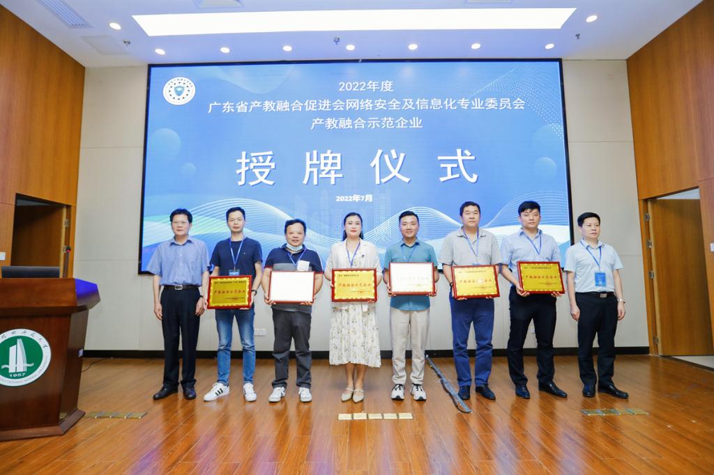 研讨会上,广东省产教融合促进会为表达会员企业对产教融合工作辛勤奉献的肯定,特举行了产教融合示范企业授牌仪式,奇安信科技股份集团有限公司、广东昱辉通信技术有限公司、麒麟软件有限公司、广州创显科教股份有限公司、分之道(广东)信息技术科技有限公司、云达信息技术有限公司、广州培生智能科技有限公司、广州星溪科技有限公司、启明星辰信息技术集团股份有限公司、华云数据控股集团有限公司、广州中长康达信息技术有限公司、广东亿迅科技有限公司等企业荣获“2022年度广东省产教融合促进会网络空间安全及信息化专业委员会产教融合示范企业奖”。