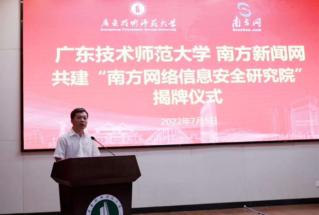 凌靖波在致辞中表示,“没有网络安全就没有国家安全,没有信息化就没有现代化。” 习近平总书记高度重视网络安全和信息化以及数字经济工作,省第十三次党代会也对网络信息安全、“数字化”战略等方面做出了新部署新要求。我校与南方新闻网在前期合作基础上成立“南方网络信息安全研究院”,推动网络信息安全领域核心技术的突破,是恰逢其时、大有可为。凌靖波对本次合作提出了三点要求,一是要服务国家战略,坚定不移推进产教融合战略,为构筑网络空间安全体系提供有力支撑;二是彰显学校办学特色和优势,推进人才培养模式改革,为培养更多信创与网络空间安全优秀人才提质赋能;三是巩固拓展合作成果,为推动信创与网络安全产业和学校事业高质量发展提供强大动力。